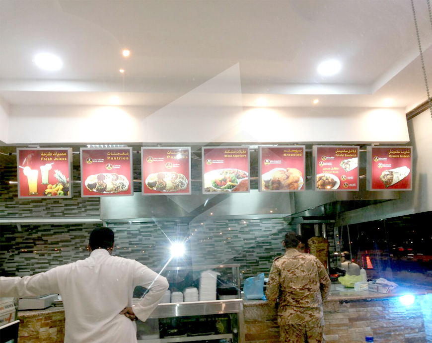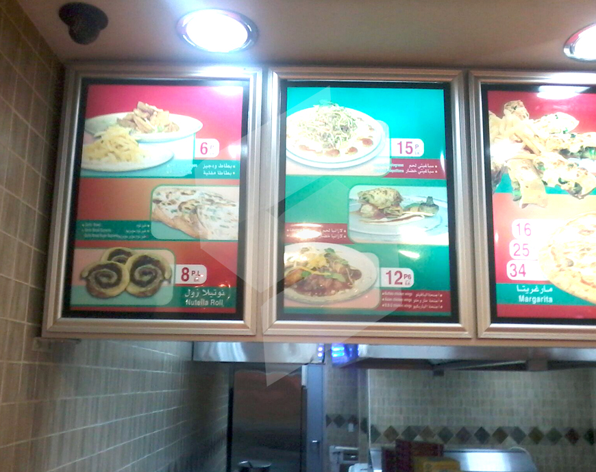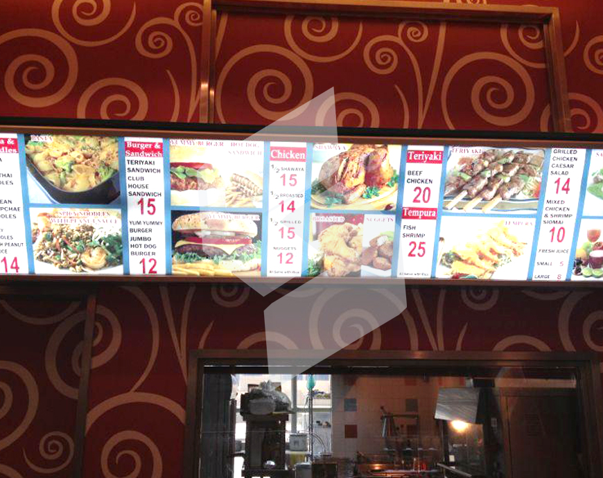 نقوم بعمل و تصنيع و تركيب لوحات الأفلام المضيئة للمطاعم و المقاهي و العيادات و المكاتب بطباعة راقية بمواد ذات جودة عالية و معمرة سواءاً مع صناديق مضيئة جديدة أو طباعة و تبديل و تركيب للأفلام الجديدة عوضاً عن القديمة.